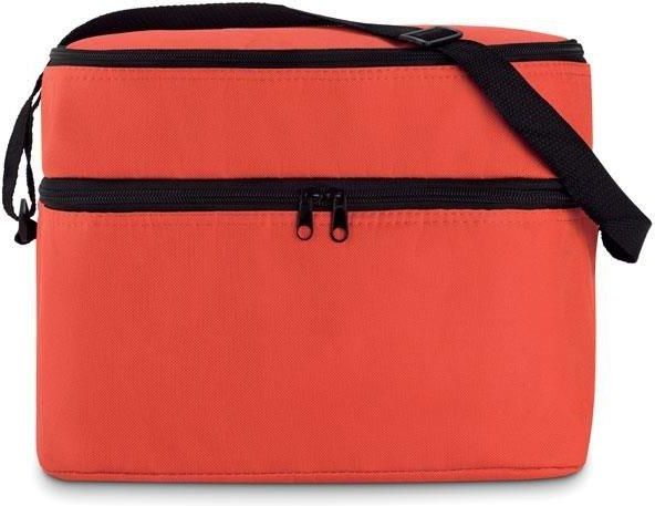 Torba termiczna 600D z 2 przegrodami wyściełanymi folią aluminiową. Posiada regulowany pasek na ramię.