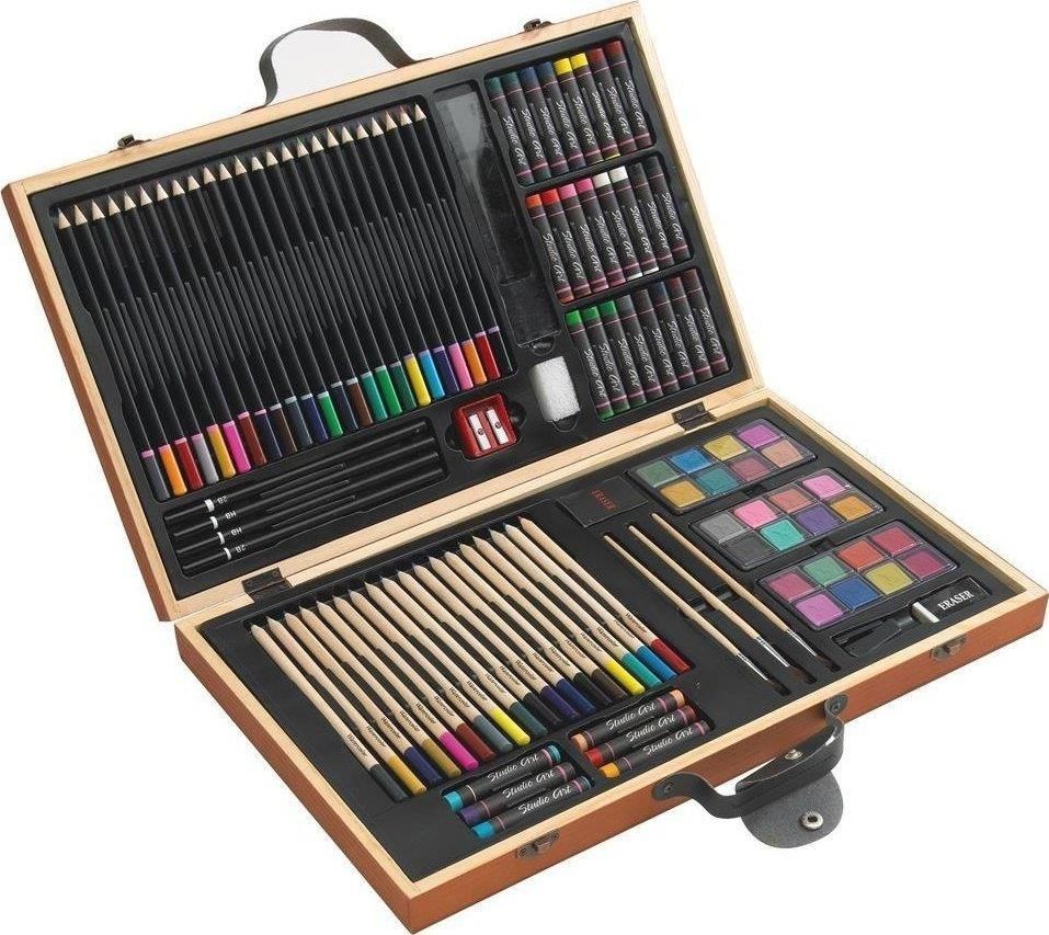 Budowa: Zestaw do malowania Monet 88 elementów zapakowany w solidne drewniane pudełko z metalowymi klamrami, zawiasami i uchwytem