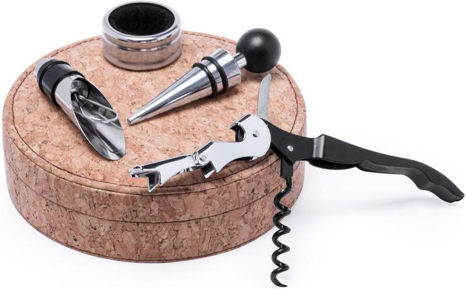Zestaw do wina 4 el. UPOMINKARNIA Brązowy Materiał: naturalny korek Wymiary: Ø15 x 4 cm Stan: Nowy Kolory: Brązowy Budowa: Zestaw do wina 4 el. w pudełku z naturalnego korka, akcesoria do wina: nóż kelnerski, pierścień, zatyczka, nalewak