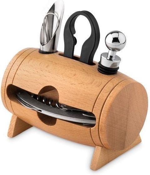 Stylowy drewniany stojak na akcesoria do wina w kształcie beczki - to prawdziwa gratka dla miłośników wina ! Nasz stojak to praktyczny i poręczny gadżet, który pomieści oraz wyeksponuje niezbędne akcesoria do serwowania wina. Wykonany jest z naturalnego drewna dzięki czemu jest nie tylko funkcjonalny, ale będzie również pasować do wystroju każdego wnętrza. Ten stojak na akcesoria do wina będzie idealnym prezentem dla każdego, kto ceni sobie organizację i estetykę. Zadbaj o swoje ulubione akcesoria i dodaj stylu do swojej przestrzeni ! Zestaw zawiera korkociąg z nożykiem do folii, okapnik, nalewak z funkcją napowietrzania i zatyczkę do butelki. Specyfikacja Produktu Wymiary : 13 x 8 x 14 cm Materiał: drewno Kolor: naturalny Opakowanie produktu: biały kartonik
