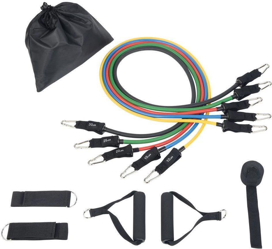Zestaw gum oporowych FITNESS TIME, czarny, czerwony, niebieski, zielony, żółty Stan: Nowy Kolory: czarny, czerwony, niebieski, zielony, żółty Waga: 1.20kg Zestaw gum oporowych do ćwiczeń FITNESS TIME. Składa się z 5 kolorowych gum oporowych (żółta - 4,53 kg, zielona - 6,80 kg, czerwona - 9,07 kg, niebieska - 11,34 kg, czarna - 13,61 kg), 2 uchwytów, 2 pasków na kostkę i 1 kotwy do drzwi. W poliestrowej torbie.