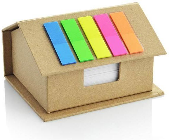 Ekologiczny pojemnik na karteczki ( 370 szt.) w kształcie domku. Dodatkowo znaczniki samoprzylepne w pięciu kolorach (po 25 znaczników w każdym kolorze). Logo wykonamy na powierzchni dachu.
