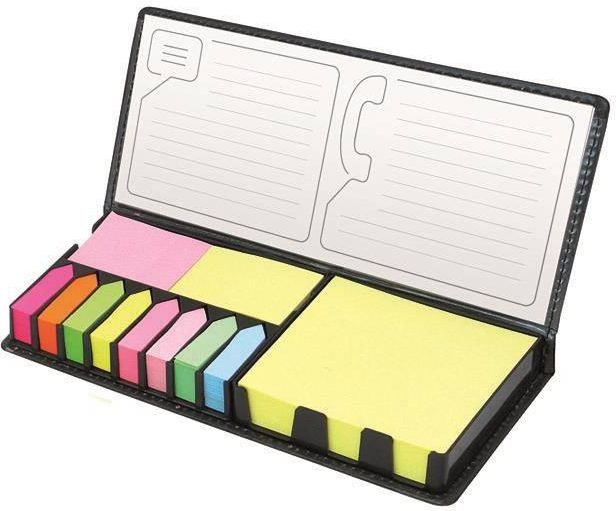 Zestaw karteczek samoprzylepnych pakowanych w czarne etui. Zestaw zawiera 1 bloczek dużych karteczek, 2 bloczki średnich karteczek i 8 małych bloczków zakładek indeksowych w różnych kolorach. Pudełko posiada miejsca na każdy z zestawów karteczek, dzięki czemu te się nie mieszają. W etui umieszczona …