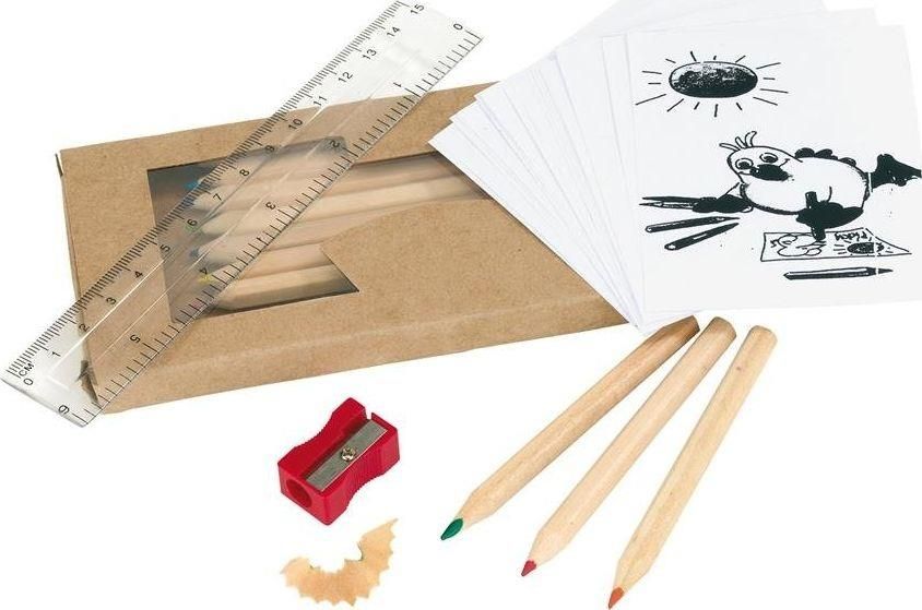 Zestaw kredek BEING BUSY zawiera książkę z obrazkami do kolorowania, 10 kredek, 15 cm linijkę i temperówkę, naostrzone.