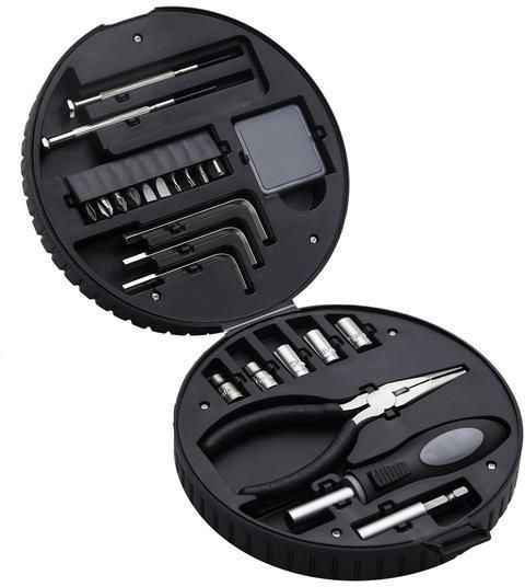 Zestaw 24 narzędzi w opakowaniu w kształcie opony samochodowej. Budowa: Wymiary: 160 x 160 x 57 mm. Materiał: stal, plastik. W skład zestawu wchodzą: rączki, przedłużki, miarki, 2 śrubokrętów, 3 kluczy imbusowych, 5 kluczy nasadowych, 10 wkrętaków.