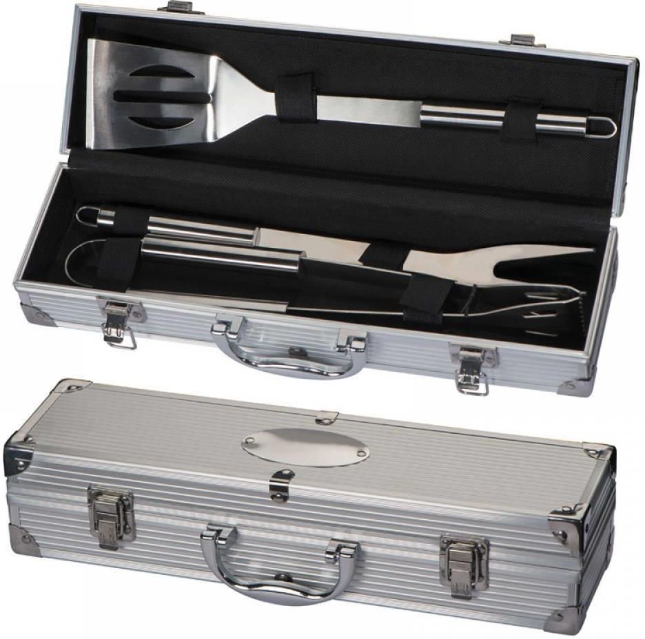 Zestaw metalowych przyborów do grilla (szczypce do obracania mięsa, łopatka i widelec) w metalowej skrzynce.