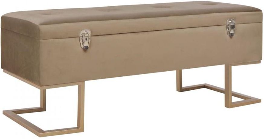 Nasza pokryta aksamitem ławka będzie przyciągającym wzrok dodatkiem do wystroju salonu, przedpokoju lub holu. Pokrycie z beżowego aksamitu jest miękkie i przyjemne w dotyku, doda także nieco koloru do wystroju wnętrza. Wewnętrzna przestrzeń do przechowywania oferuje dodatkowe miejsce na różne przedmioty. Malowane proszkowo, żelazne nogi w złotym kolorze zapewniają stabilność i trwałość konstrukcji. Nasza ławka zaczaruje przestrzeń w Twoim mieszkaniu, stając się nieodłączną częścią jego wyposażenia. Montaż pokrytej aksamitem ławki jest prosty. Kolory: beżowy i złoty Materiał: aksamitna tapicerka i żelazne nogi malowane proszkowo Wymiary: 105 x 40 x 44 cm (szer. x gł. x wys.) Z wewnętrznym schowkiem Materiał: Poliester: 100%