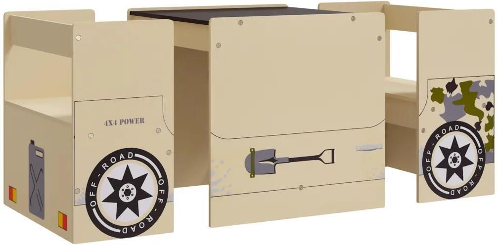 Zestaw mebli z motywem samochodu terenowego składa się z dwóch krzesełek i stolika z blatem z tablicy kredowej. Z pewnością przyciągnie on wzrok Twojego malucha, który na pewno go pokocha. Skonstruowany z trwałej płyty MDF oraz pomalowany nietoksyczną farbą zestaw jest bezpieczny dla dzieci, łatwy do czyszczenia i utrzymania. Oprócz czytania, stolik może posłużyć również do układania puzzli, gier planszowych, wykonywania prac plastycznych i jedzenia przekąsek. Posiada on blat z tablicy kredowej, który pozwala ćwiczyć swoje umiejętności i poznawać świat. Ponadto oparcie krzesła zawiera półkę oferującą dodatkowe miejsce do przechowywania. Jest to idealny zestaw dla dzieci do użytku w domu, szkole, przedszkolu itp. Kolor: beżowy Materiał: MDF Wymiary stolika: 48 x 48 x 48 cm (dł. x szer. wys.) Wymiary krzesełka: 48 x 24 x 48 cm (szer. x gł. x wys.) Nietoksyczna farba Tablica kredowa do rysowania Oparcie krzesła może pełnić funkcję półki na książki Maksymalne obciążenie: 50 kg Zalecany wiek: 6-12 lat Wymagany montaż: tak Zawartość przesyłki: 1 x stół 2 x krzesło