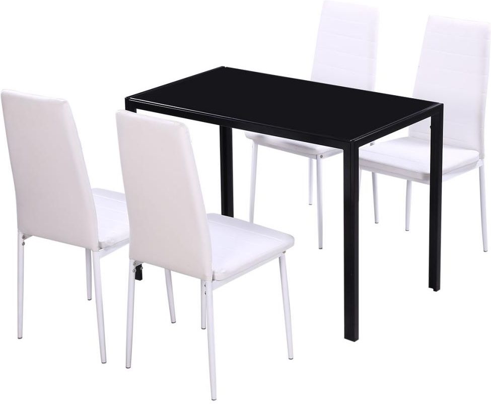 Nowoczesny, elegancki zestaw składający się z 5 elementów to idealny produkt dla osób, które chcą dodać stylu wnętrzu swojemu domu. Blat stołu został wykonany z mocnego, hartowanego szkła, które można łatwo wyczyścić. Każde krzesło jest obite wysokiej jakości sztuczną skórą. Wypełnione siedzisko zapewnia komfort. W skład przesyłki wchodzi 1 stół i 4 krzesła. Kolor: czarny i biały Materiał stołu: hartowane szkło i żelazna rama Materiał krzesła: sztuczna skóra + drewniana rama + żelazne nogi Wymiary stołu: 105 x 60 x 74 cm (dł. x szer. x wys.) Wymiary krzeseł: 43 x 50 x 96 cm (szer. x gł. wys.) Wymiary siedziska: 43 x 39 cm (szer. x gł.) Wysokość siedziska nad ziemią: 46 cm W skład przesyłki wchodzi 1 stół i 4 krzesła Materiał: Bawełna: 5%, PCV: 95%