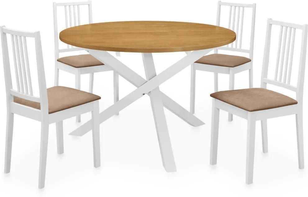5-częściowy zestaw mebli do jadalni, MDF, biały vidaXL Kolor: Array Ten 5-częściowy zestaw jadalniany ma ponadczasową i trwałą konstrukcję oraz doda nieco stylu Twojemu wnętrzu. Stół i krzesła, wykonane z litego drewna kauczukowca, są bardzo stabilne i trwałe. Oparcia i poduszki krzeseł zwiększają komfort siedzenia. Ten zestaw do jadalni jest łatwy w czyszczeniu za pomocą wilgotnej ściereczki. Montaż zestawu jest łatwy. Przesyłka obejmuje 1 stół i 4 krzesła. Stół jadalniany: Kolor: biały i brązowy Wymiary: 120 x 75 cm (śr. x wys.) Materiał: lite drewno kauczukowe + blat z płyty MDF + fornir drewna kauczukowego Krzesła: Kolor: biały i kremowy Materiał krzesła: lite drewno kauczukowe Materiał poduszki: 100% poliester Wymiary całkowite: 40 x 49 x 88,5 cm (szer. x gł. x wys.) Szerokość siedziska: 40 cm Głębokość siedziska: 40 cm Wysokość siedziska nad ziemią: 44 cm Przesyłka obejmuje 1 stół i 4 krzesła z poduszkami