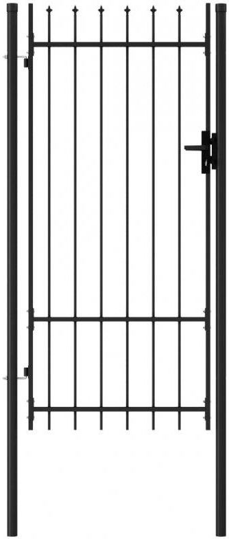 Ta furtka ogrodzeniowa będzie nowocześnie wyglądającym, praktycznym przejściem, oddzielającym Twój ogród od świata zewnętrznego. Bardzo stabilna oraz wytrzymała bramka zapewni praktyczną barierą ochronną Twojego ogrodu, patio lub tarasu. Brama o pionowych prętach zakończonych grotami oraz mocnych, poziomych łączeniach zapewni duży stopień bezpieczeństwa, tworząc fantastyczne wejście na Twoją posesję. Wyprodukowana z mocnej stali i malowana proszkowo konstrukcja jest odporna na rdzę i korozję. Do bramy ogrodzeniowej dołączone są zawiasy z bolcami, słupki montażowe oraz solidny zamek z 3 pasującymi kluczami. Ta bramka ogrodowa jest świetnym połączeniem stylu, wytrzymałości, stabilności oraz odporności na korozję! Kolor: czarny Materiał: malowana proszkowo stal Wymiary całkowite: 100 x 250 cm (szer. x wys.) Wysokość skrzydła bramy: 200 cm Średnica słupka: 40 mm Z grotami W zestawie znajdują się 3 klucze