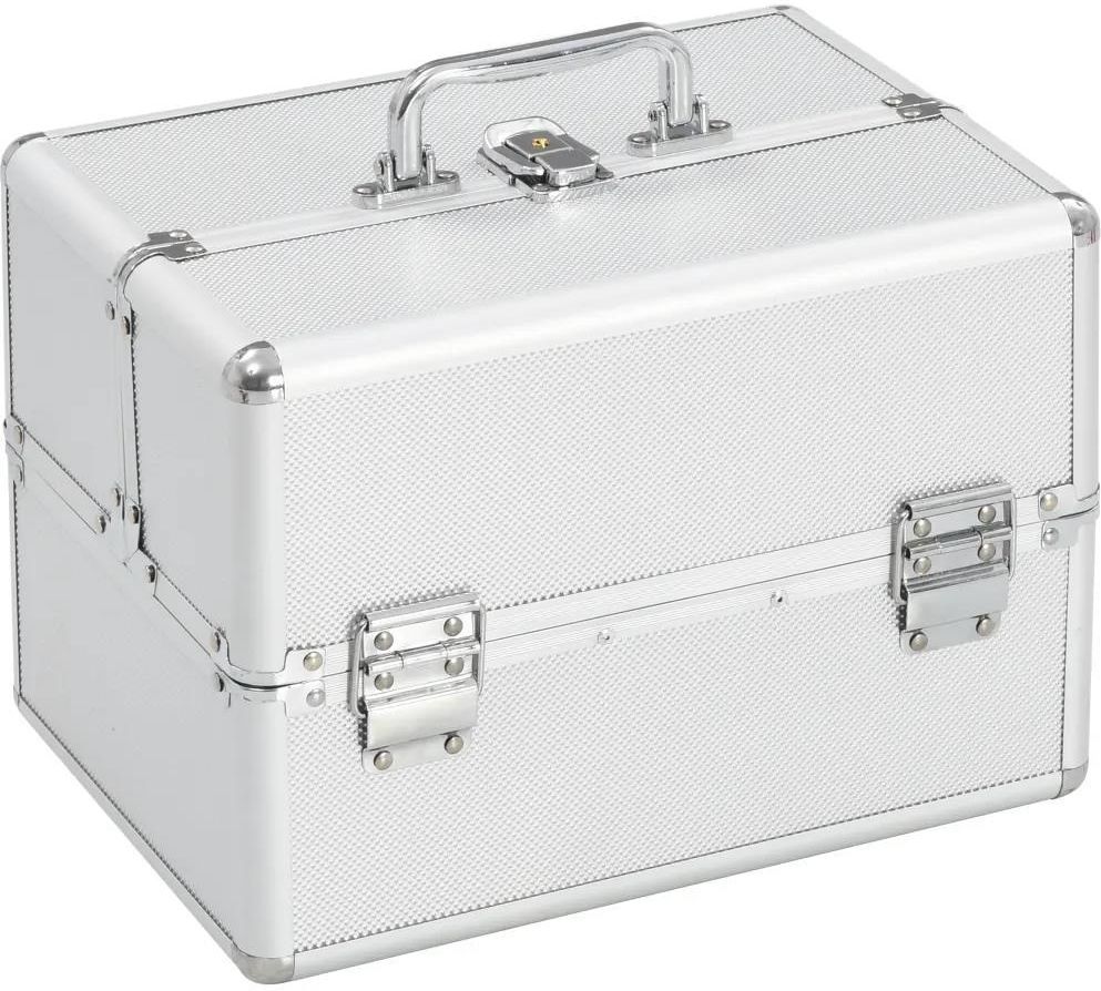 Przechowuj wszystkie swoje kosmetyki w jednym miejscu dzięki naszemu stylowemu kuferkowi! Nasza skrzynka na akcesoria do makijażu jest świetnym rozwiązaniem na przechowywanie kosmetyków w uporządkowany sposób. Po prostu spakuj wszystko, co jest Ci potrzebne w praktyczny kuferek i zabierz ze sobą! Wykonany z drewna, arkuszy ABS i aluminium kuferek na kosmetyki pozwoli wygodnie przechować produkty do pielęgnacji i utrzymać je w idealnym stanie. Ta skrzynka na kosmetyki oferuje rozsuwaną górę i tace, zapewniając mnóstwo miejsca na kosmetyki i akcesoria do makijażu. Ponadto wyposażono ją w uchwyt pozwalający na łatwe zabranie jej ze sobą, dokądkolwiek się wybierasz! Kolor: srebrny Materiał: aluminium, ABS i drewno Wymiary: 22 x 30 x 21 cm (dł. x szer. x wys.) Rozsuwana górna część i tace Możliwość zamknięcia (załączony 1 klucz) Z uchwytem do przenoszenia