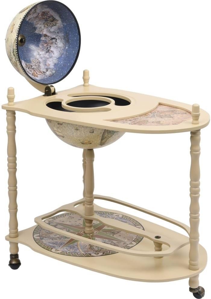 Drewniany globus otwiera się, odsłaniając barek z mnóstwem miejsca na wina, wódki, napoje i kieliszki, dzięki czemu możesz możesz trzymać je poza zasięgiem wzroku, a jednocześnie w sposób łatwo dostępny. Barek jest wyposażony w stolik oraz dolną półkę, na których również można przechowywać butelki …