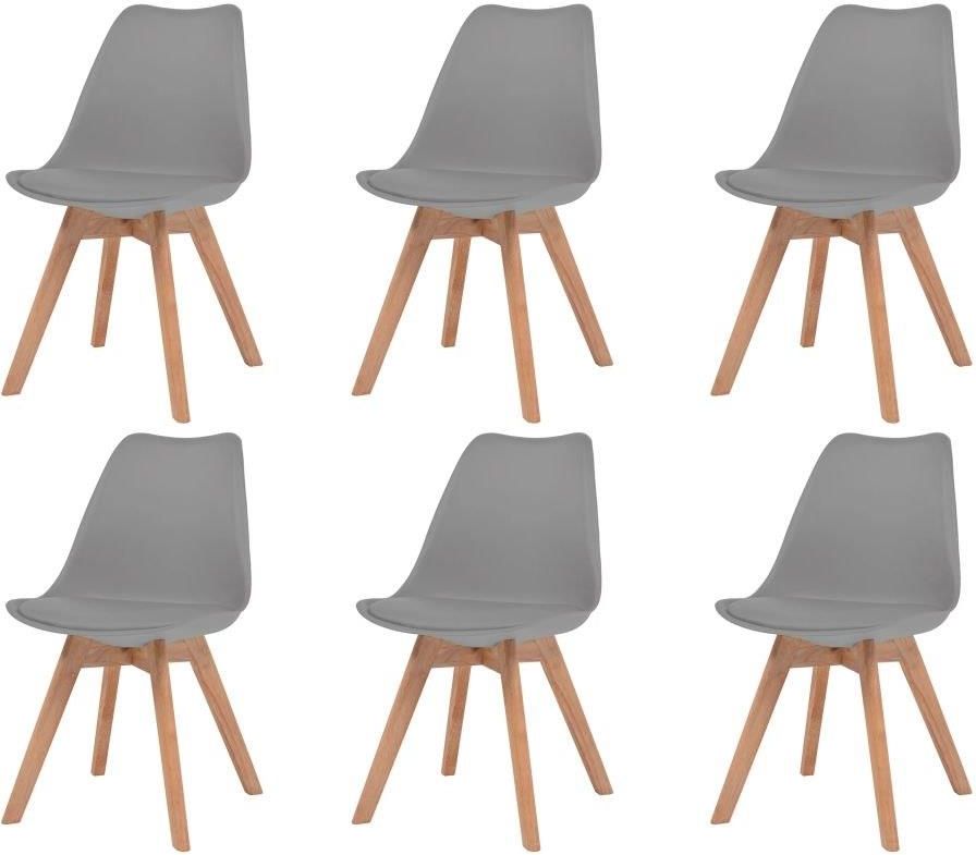 Nasze krzesła stołowe mają elegancki i ponadczasowy wygląd, dzięki czemu wyróżnią się w kuchni lub jadalni. Są idealne do czytania lub spożywania niedzielnego obiadu. Krzesła mają ergonomicznie zaprojektowane siedziska ze zintegrowanymi oparciami, o nowoczesnej, wygiętej formie. Są bardzo wygodne dzięki wbudowanym poduszkom ze sztucznej skóry. Osadzone na solidnych, drewnianych nogach krzesła są atrakcyjne, mocne i trwałe. Montaż jest naprawdę łatwy. Przesyłka zawiera 6 krzeseł. Kolor siedziska: szary Materiał krzesła: plastik, drewno bukowe, drewno kauczukowe Materiał poduszki: sztuczna skóra (100% poliuretan) Wymiary: 48 x 53 x 83 cm (szer. x gł. x wys.) Głębokość siedziska: 41 cm Wysokość siedziska nad ziemią: 46 cm Montaż jest bardzo prosty W skład przesyłki wchodzi 6 krzeseł