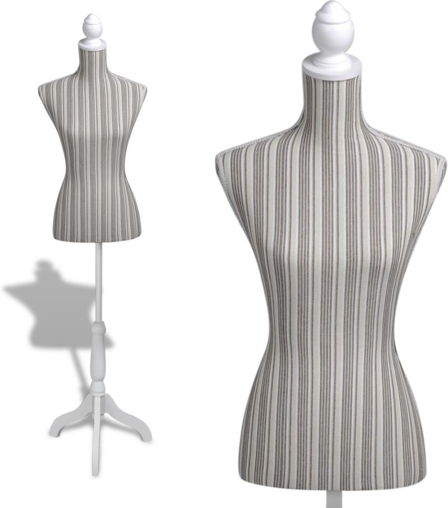 Manekin kobiecy, krawiecki, płótno w paski Ten manekin damski z płóciennym wykończeniem jest niezbędny dla studentów i projektantów mody, krawców i sklepów odzieżowych do prezentowania swoich wyrobów tekstylnych oraz odzieży. Ten manekin damski można regulować na wysokość w zakresie od 133 cm do 168 cm. Dzięki temu łatwo będzie go dostosować do swoich potrzeb. W skład przesyłki wchodzą: manekin (korpus), stojak z rurą, oraz ozdobne zakończenie szyi. Materiał: płótno (tułów), MDF (trójnóg), lite drewno (końcówka i pokrycie słupka), oraz stalowa rurka (słupek) Ramiona: 37 cm Klatka piersiowa: 84 cm Talia: 67 cm Biodra: 90 cm Regulowana wysokość: 133 - 168 cm Wysokość tułowia: 67 cm Długość szyi: 8,5 cm Materiał: Len: 100%