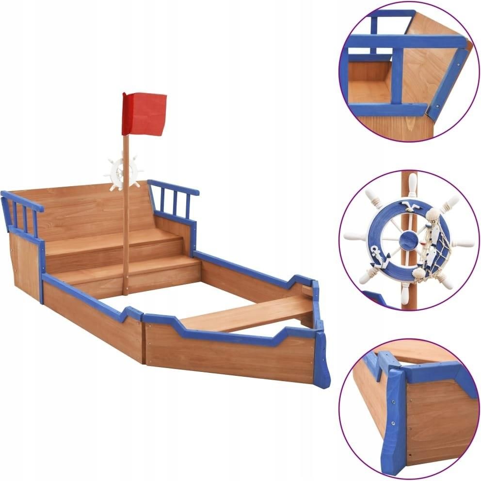 vidaXL Piaskownica statek piracki, drewno jodłowe, vidaXL Ta fantastyczna, drewniana piaskownica w oryginalnej formie statku pirackiego jest idealnym sprzętem do zabawy na świeżym powietrzu. Zachęci dzieci do zabawy na dworze, budowania zamków z piasku i rozwijania wyobraźni. Możesz też wypełnić piaskownicę piłeczkami zamiast piasku, aby zamienić ją w basenik z piłeczkami. Ten plac zabaw zawiera piaskownicę, miejsce do siedzenia i miejsce do schowania za oparciem. Jest on ozdobiony masztem z flagą i sterem, dzięki czemu wygląda jak prawdziwy statek, a Twoje dziecko może wyobrazić sobie, że jest kapitanem. Spraw swoim dzieciom godziny kreatywnej zabawy za sprawą tej drewnianej piaskownicy! Uwaga: drewno to surowiec naturalny i może wykazywać niedoskonałości. Kolor: Array Ta fantastyczna, drewniana piaskownica w oryginalnej formie statku pirackiego jest idealnym sprzętem do zabawy na świeżym powietrzu. Zachęci dzieci do zabawy na dworze, budowania zamków z piasku i rozwijania wyobraźni. Możesz też wypełnić piaskownicę piłeczkami zamiast piasku, aby zamienić ją w basenik z piłeczkami. Ten plac zabaw zawiera piaskownicę, miejsce do siedzenia i miejsce do schowania za oparciem. Jest on ozdobiony masztem z flagą i sterem, dzięki czemu wygląda jak prawdziwy statek, a Twoje dziecko może wyobrazić sobie, że jest kapitanem. Spraw swoim dzieciom godziny kreatywnej zabawy za sprawą tej drewnianej piaskownicy! Uwaga: drewno to surowiec naturalny i może wykazywać niedoskonałości. Materiał: drewno jodłowe Wymiary całkowite: 190 x 94,5 x 101 cm (dł. x szer. x wys.) Wymiary wewnętrzne: (90-130) x 86,5 x 20 cm (dł. x szer. x wys.) Wysokość schodków: 14 cm / 27 cm Maksymalna waga użytkownika: 50 kg Z motywem statku pirackiego Z ozdobnym masztem i flagą oraz sterem Wymagany montaż: tak OSTRZEŻENIE: Nieodpowiednie dla dzieci poniżej 36 miesięcy. OSTRZEŻENIE: Do użytku pod bezpośrednim nadzorem osoby dorosłej. Kolor: Array vidaXL