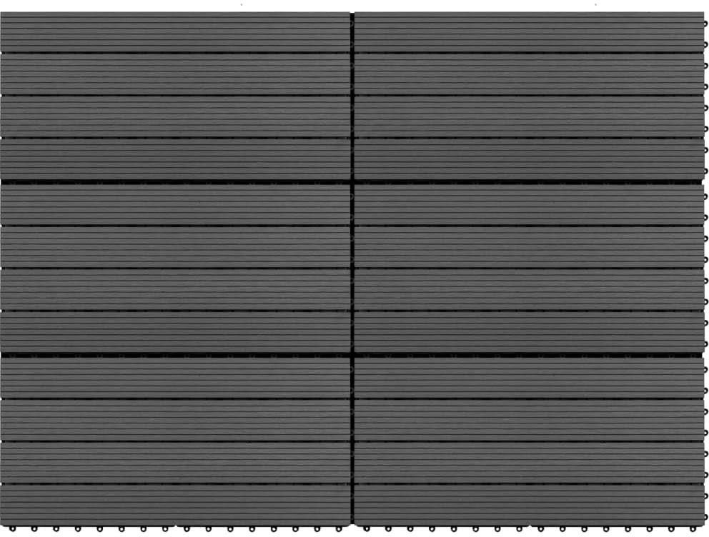 W zestawie płytek tarasowych znajduje się 6 elementów o łącznej powierzchni 1,08 m². Jest idealny na tarasy i balkony, do łazienek, a także na obszar przy basenie lub spa. Płytki z WPC mają funkcję szybkiego łączenia, która umożliwia łatwy montaż bez użycia narzędzi. Wykonane z kompozytu drewna i plastiku płytki są wodoodporne i bardzo trwałe, dlatego posłużą na lata użytkowania. Kolor: czarny Materiał: WPC Wymiary pojedynczej płytki: 60 x 30 cm (dł. x szer.) Wymiary całkowite: 1,08 m² Zawartość przesyłki: 6 x płytka