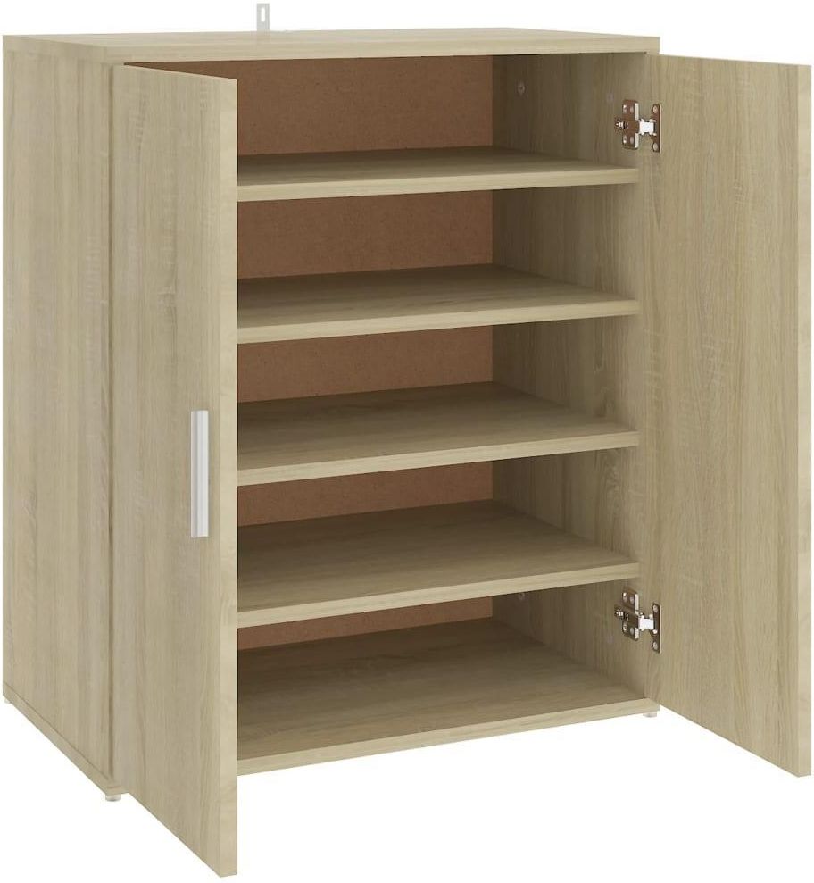 Szafka na buty, kolor dąb sonoma, 60x35x70 cm, płyta wiórowa vidaXL Kolor: Array Rozmiar: Array Ponadczasowa szafka na buty oferuje idealne rozwiązanie dla przechowywania obuwia w sypialni lub przedpokoju. Bałagan na podłodze nie będzie Cię więcej denerwować! Szafka do przedpokoju wykonana jest z płyty wiórowej, niezwykle trwałej i wytrzymałej. Ma 5 półek oferujących wystarczająco dużo miejsca na przechowywanie butów w porządku. Dzięki dwóm drzwiczkom organizer do przechowywania obuwia chroni je przed kurzem i utrzyma poza zasięgiem wzroku. Dodatkowo mebel można zamontować na podłodze lub ścianie w zależności od potrzeb. Kolor: dąb sonoma Materiał: płyta wiórowa Wymiary: 60 x 35 x 70 cm (dł. x szer. x wys.) Wymiary wewnątrz (na półkę): 56,8 x 12,2 cm (dł. x wys.) Możliwość montażu na ścianie lub na podłodze Wymagany montaż: tak OSTRZEŻENIE: aby zapobiec przewróceniu się produktu, musi on zostać przymocowany do ściany za pomocą dołączonego elementu.