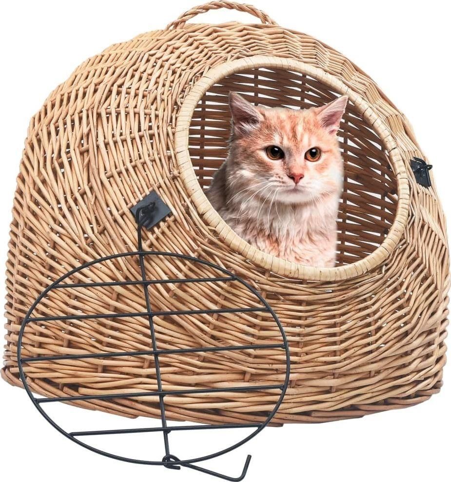 VidaXL Transporter dla kota, 60x45x45 cm, naturalna wiklina vidaXL Kolor: Brąz Rozmiar: 60 x 45 x 45 cm Za sprawą tego transportera Twój kot będzie czuł się bezpiecznie podczas podróży lub wizyty u weterynarza. Ponadczasowy design sprawia, że produkt będzie się ładnie prezentował w każdym wnętrzu. Wykonany z naturalnej wikliny kosz zapewni Twojemu małemu przyjacielowi miejsce do relaksu i drapania, ku jego wielkiemu zadowoleniu. Solidne drzwiczki gwarantują bezpieczeństwo zwierzaka w czasie podróży, a uchwyt u góry ułatwia przenoszenie i umożliwia zawieszenie kosza, ku jeszcze większej uciesze Twojego kociego pupila. Materiał: naturalna wiklina, żelazo Wymiary: 60 x 45 x 45 cm (dł. x szer. x wys.) Z pętelką na górze Długość zwierzęcia: mniej niż 50 cm Typ zwierzęcia: dorosłe koty