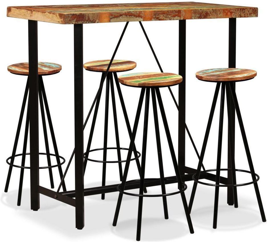 Zestaw mebli barowych z litego drewna odzyskanego, 5 szt. Ten świetny zestaw mebli barowych o industrialnym wyglądzie będzie charakterystycznym dodatkiem do każdego domu, baru lub restauracji. Stolik barowy i stołki zostały wykonane z litego drewna odzyskanego, które posiada cechy charakterystyczne różnych gatunków drewna, takich jak drewno tekowe, mango, akacja itd. Drewno odzyskane jest solidne, mocne, wytrzymałe i piękne. Ślady zużycia nadają każdemu meblowi wyjątkowy wygląd, a stalowe nogi podkreślają spektakularne wykonanie w industrialnym stylu. Każdy etap procesu produkcji wykonywany jest z najwyższą dbałością, zarówno łączenie, polerowanie, malowanie, jak i lakierowanie. W skład dostawy wchodzi: 1 stolik barowy i 4 stołki barowe Montaż jest prosty. Ważna uwaga: kolory i usłojenie drewna poszczególnych egzemplarzy mogą się różnić, co sprawia, że każdy z nich jest jedyny w swoim rodzaju. Wysyłka odbywa się losowo, dzięki czemu otrzymasz absolutnie wyjątkowy produkt. Materiał: lite drewno odzyskane i stal Powierzchnia szlifowana, malowana i lakierowana Wymiary stolika barowego: 120 x 60 x 107 cm (dł. x szer. x wys.) Wymiary stołka barowego: 30 x 76 cm (śr. x wys.) Przesyłka obejmuje: 1 stolik barowy i 4 stołki barowe Łatwy montaż Maksymalnie 110 kg na siedzisko.