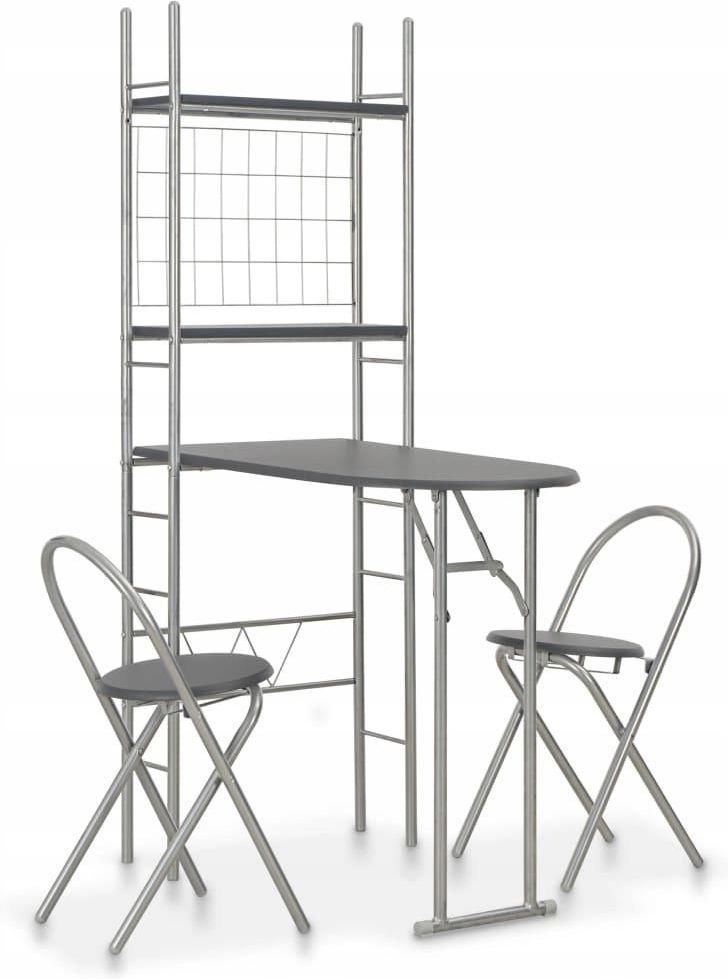 VidaXL 3-cz. zestaw składanych mebli z regałem do jadalni, MDF i stal vidaXL Kolor: Array Wykonany z trwałej płyty MDF i stali, 3-częściowy zestaw mebli jadalnianych to uniwersalny i wyróżniający się dodatek do wnętrza domu, ogrodu, baru, pubu lub restauracji. Wykonane z trwałej płyty MDF powierzchnie są łatwe w utrzymaniu w czystości. Stalowe ramy zapewniają bardzo dobrą stabilność. Nieużywane krzesła można złożyć, co pozwala zaoszczędzić nieco miejsca. Co więcej, stolik połączony jest z wyposażonym w 2 półki regałem, możesz więc przechować rzeczy uporządkowane i pod ręką. Blat stołu również można złożyć, dzięki czemu świetnie sprawdzi się w ograniczonej przestrzeni. Montaż zestawu jest łatwy. Przesyłka obejmuje 1 stół i 2 krzesła. Kolor: czarny i srebrny Materiał: MDF + stal Wymiary stołu (po rozłożeniu): 90 x 56 x 165 cm (dł. x szer. x wys.) Wymiary stołu (po złożeniu): 56 x 24 x 165 cm (szer. x gł. x wys.) Wymiary krzesła (po rozłożeniu): 35 x 37 x 67 cm (szer. x gł. x wys.) Wymiary krzesła (po złożeniu): 35,5 x 80,5 cm (szer. x wys.) Wysokość siedziska nad ziemią: 60 cm Odległość pomiędzy dwoma półkami: 44 cm Regał z 2 półkami Krzesła można łatwo złożyć do przechowywania i transportu Przesyłka obejmuje 1 stół z regałem i 2 krzesła OSTRZEŻENIE: aby zapobiec przewróceniu się produktu, musi on zostać przymocowany do ściany za pomocą dołączonego elementu montażowego Maksymalne obciążenie: 110 kg Legal Documents:Więcej informacji na temat zabezpieczenia mebli przed przewróceniem można znaleźć tutaj