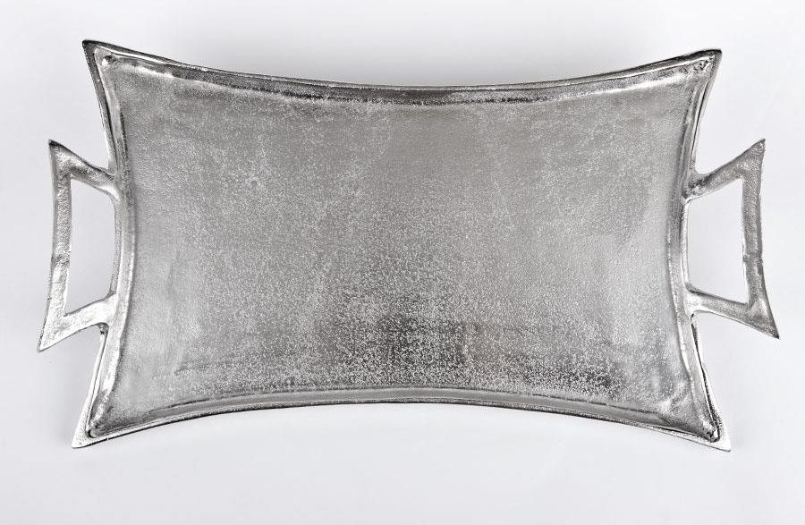 Taca dekoracyjna 56cm Luksusowa taca dekoracyjna z poręcznymi uchwytami. Posiada kształt czworokąta naciągniętego na rogach. Bardzo efektownie się prezentuje. Przykuwa uwagę nie tylko wyglądem, ale także doskonałym wykonaniem z dbałością o szczegóły. Od spodu naklejone są filcowe podkładki, które chronią blat i wszelkie powierzchnie przed zarysowanie, a także niechcianym przesuwaniem się. Taca może pełnić funkcje dekoracyjną, a także praktyczną. Dzięki swym pokaźnym rozmiarom pomoże przy nakryciu stołu. Z łatwością pomieści kilka szklanek czy filiżanek, które finalnie trafią na stół. Można wykorzystać ją także do serwowania przekąsek w pojemnikach, np. dipów, sosów itp. Taca jest niebywałą ozdobą pomieszczenia. Jej kształt, kolor i detale świadczą o wysokiej jakości, które z kolei przekładają się na wystawny wygląd. Wnosi ona do wnętrza odrobinę luksusu. Zachwyca pod każdym względem. Metalowa taca ozdobna to niezwykle dostojna propozycja, która udekoruje nie tylko stół, ale także komody, przeszklone witryny czy półki ścienne. Specyfikacja: Materiał: stop metali Kolor: srebrny Wykończenie: chropowate Mycie ręczne W naszym sklepie Witek Home dostępne są także inne ozdoby z tej kolekcji. Skompletuje je wszystkie! Stwórz niesamowitą kolekcję , która ożywi wnętrze i nada mu charakteru. Szerokość (cm): 32 Wysokość (cm): 5 Długość/głębokość (cm): 56 Waga (kg): 2 Kolor: srebrny Kształt: Prostokątny Materiał wykonania: Metal nr katalogowy (257306)
