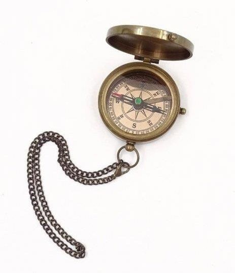 Zamykany kompas z łańcuszkiem w skórzanym etui C-64Materiał: mosiądzKolory obudowy: mosiężnyWymiary: średnica – 5 cmCzytelna róża wiatrówŁańcuszek do powieszenia kompasuEtui skórzane...