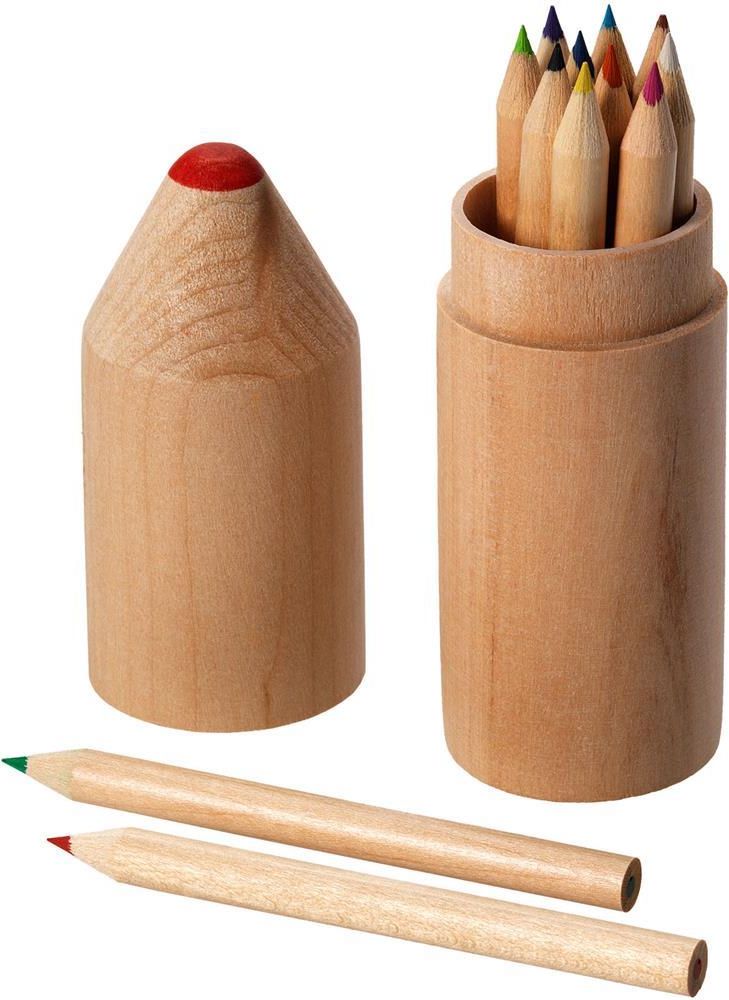 12 kredek. Drewniany pojemnik w kształcie kredki. Nadruk niemożliwy na poszczególnych elementach.