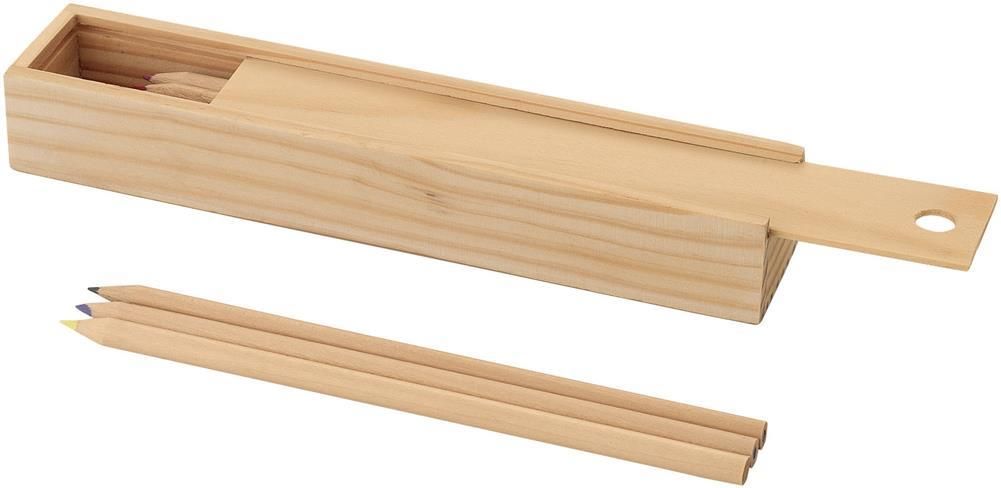 Zestaw zawiera: 12 kredek w drewnianym pudełku ze zdejmowaną pokrywką, która może posłużyć jako linijka. Nadruk niemożliwy na poszczególnych elementach.