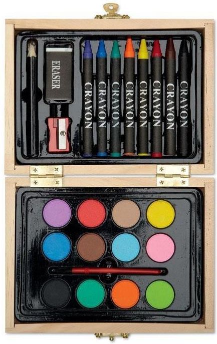 Zestaw plastyczny w skrzynce Creative Colour Zestaw do malowania Creative colour zawierający 8 woskowych kredek, farbki, pędzel, ołówek, temperówkę oraz gumkę Całość zapakowana w piękną, drewnianą skrzyneczkę z pewnością zapewni dzieciom fantastyczną, kreatywną zabawę. Wymiary: 15,6 x 12,6 x 2,9 cm