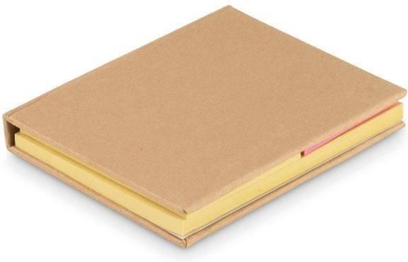 Zestaw samoprzylepnych karteczek w różnych rozmiarach, okładka z mocnego papieru z recyklingu. W komplecie 25 samoprzylepnych fluorescencyjnych pasków w 5 różnych kolorach i dwa bloczki żółtych kartek samoprzylepnych, po 50 i 25 karteczek.