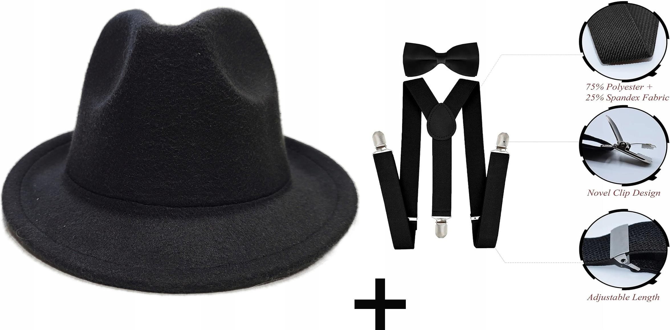 zestaw 3 elementy męski w klimacie lat 20tych Al Capone Wielki Gatsby dobrej jakości kapelusz obwód 58cm, szelki i muszka, na innych ofertach można dokupić zestaw dla kobierty, do kompletu dla pary. Polecam sprawdzic pozostałe oferty