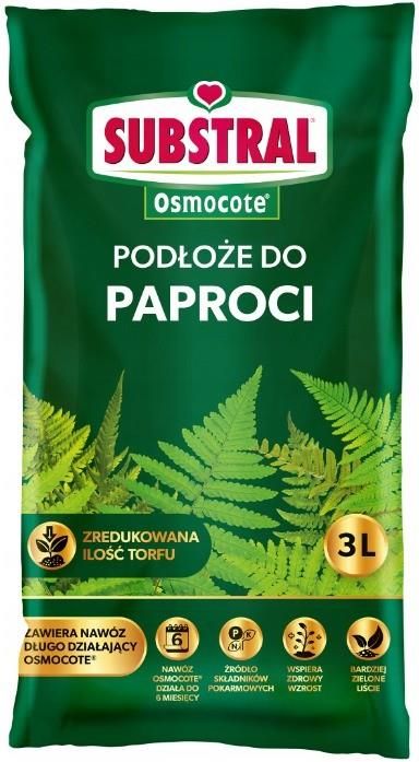Cechy produktu · gotowe podłoże · ulepszona formulacja · do paproci · zawiera extra długo działający nawóz · brak potrzeby nawożenia przez 6 miesięcy po sadzeniu · opakowanie: 3 l Opis produktu Substral Osmocote® Podłoże do Paproci to gotowe podłoże stworzone z myślą o przesadzaniu i sadzeniu wszelkich gatunków paproci zarówno w domu, jak i w ogrodzie. Zawartość mieszanki nawozów w tym podłożu Substral Osmocote® to źródło składników pokarmowych, wspierających formowanie korzeni i dalszy rozwój paproci. Odczyn podłoża w zakresie pH 5,5-6,0 jednocześnie zapewnia optymalne warunki dla rozwoju i wzrostu paproci. Substral Osmocote® Podłoże do Paproci to klucz do utrzymania zdrowych i bujnie rozwijających się paproci, dostarczając im doskonałe warunki do pełnego rozwoju. Cechy Podłoża Substral Osmocote® do Paproci: Mieszanka Składników Pokarmowych: Zawartość mieszanki nawozu długodziałającego Osmocote®, stanowi źródło składników pokarmowych, wspierających formowanie korzeni oraz dalszy wzrost roślin. Optymalne Warunki pH: Odczyn podłoża o zakresie pH 5,5-6,0 zapewnia optymalne warunki rozwoju roślin. Skład Wysokiej Jakości: Torf wysoki (utrzymuje powietrze) Torf niski (utrzymuje wilgoć) Kora Włókno drzewne Nasze podłoże jest wzbogacone innowacyjnym nawozem Osmocote® o wydłużonym działaniu. Ten unikalny nawóz uwalnia się do gleby każdego dnia w małej dawce, reagując na temperaturę i wilgoć podłoża. Dzięki temu rośliny są nawożone codziennie przez cały sezon. Skład produktu · torf niski · torf wysoki · kora · włókna drzewne · nawóz extra długo działający Osmocote