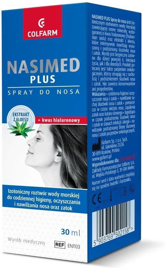 Nasimed Plus spray do nosa 30 ml Nasimed Plus Spray do nosa jest izotonicznym roztworem wody morskiej zawierającej cenne minerały, wzbogaconej o kwas hialuronowy (hialuronian sodu) oraz ekstrakt z aloesu, które intensywnie nawilżają wysuszoną i podrażnioną śluzówkę nosa i zatok. Wyrób jest …