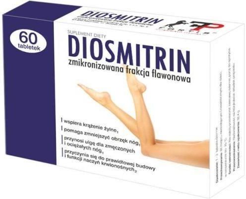 Suplement diety Suplement diety zawiera unikalne połączenie zmikronizowanej frakcji flawonowej (diosminy i hesperydyny), wyciągu z ruszczyka kolczastego oraz rutyny i witaminy C. Mikronizacja zapewnia 2 razy wyższą absorpcję frakcji flawonowych w porównaniu z flawonami niezmikronizowanymi. Suplement diety Diosmitrin dzięki zawartości wyciągu z ruszczyka kolczastego wspiera krążenie żylne, pomaga zmniejszyć obrzęk nóg oraz przynosi ulgę dla zmęczonych i ociężałych nóg. Zastosowanie: uzupełnienie diety w składniki zawarte w produkcie. Zalecane spożycie: dorośli: 1 – 2 tabletki dziennie. Składniki: mikronizowana frakcja flawonowa (diosmina/hesperydyna), celuloza mikrokrystaliczna (substancja wypełniająca), wyciąg z ruszczyka kolczastego, kwas l-askorbinowy (witamina C), rutyna, stearynian magnezu (substancja przeciwzbrylająca), dwutlenek krzemu (substancja przeciwzbrylająca). 1 tabletka zawiera: diosmina 270mg, wyciąg z ruszczyka kolczastego 50mg, kwas l-askorbinowy (witamina C) 40mg (50%)*, hesperydyna 30mg, rutyna 15mg. *RWS - Referencyjna Wartość Spożycia. Przeciwwskazania: nie należy stosować w przypadku nadwrażliwości na którykolwiek składnik preparatu. Ważne wskazówki: Nie przekraczać zalecanej porcji do spożycia w ciągu dnia. Produkt nie może być stosowany jako substytut (zamiennik) zróżnicowanej diety i zdrowego trybu życia. Zrównoważony sposób żywienia prawidłowy tryb życia jest ważny dla funkcjonowania organizmu człowieka. Preparat należy przechowywać w suchym miejscu, w temperaturze do 25°C, w sposób niedostępny dla małych dzieci. Producent: Fortis Pharmaceuticals Sp. z o.o. Sp. k. Żniwna 28 42-400 Zawiercie
