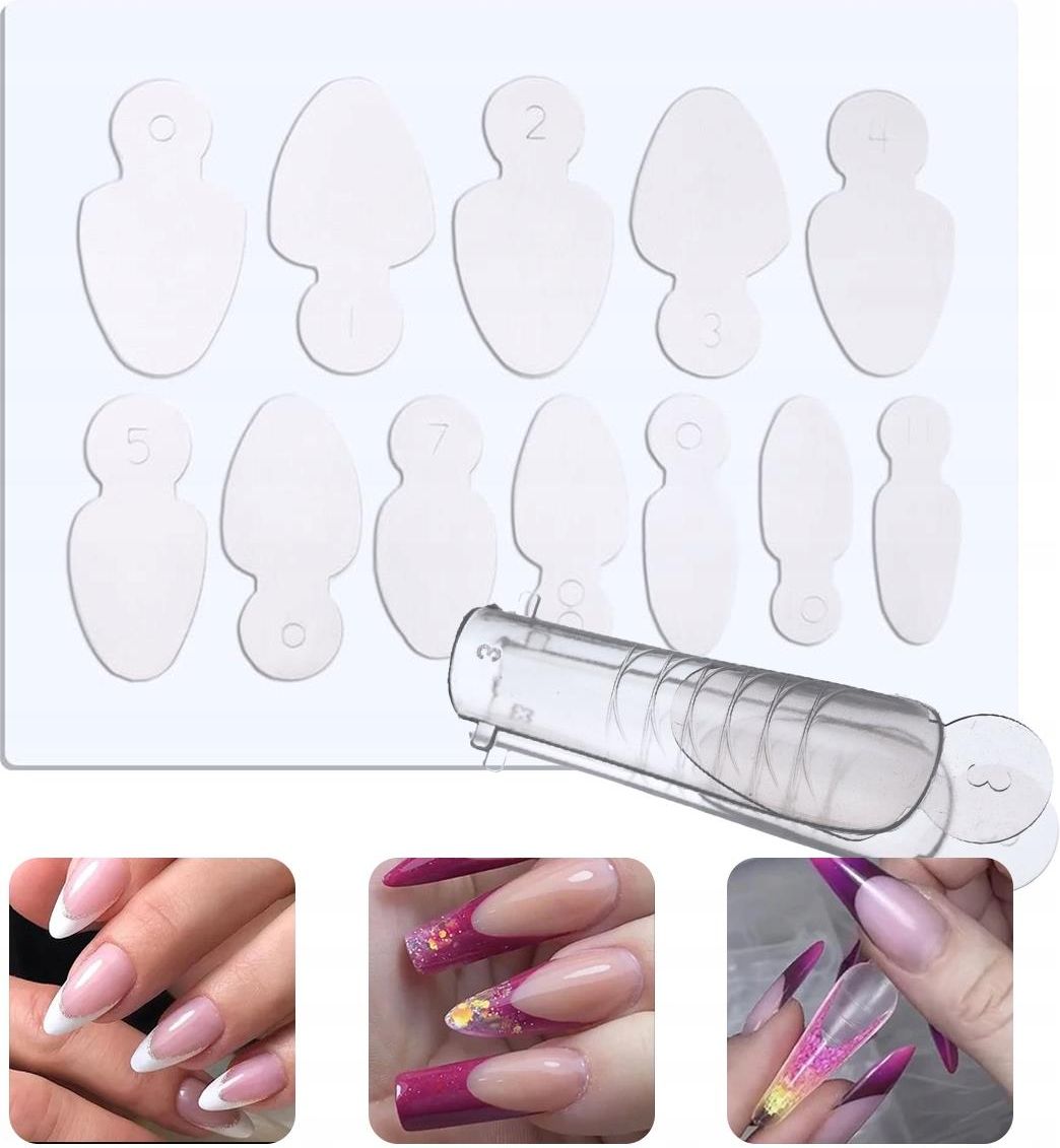 12x Szablon Silikonowa Forma Do Frencha Paznokci MOLLYLAC Dual Form Owal Krótki Combo system dual form silikonowe formy do frencha MollyLac owal krótki 12 szt Silikonowe formy w połączeniu z górnymi dual formami pomogą Ci stworzyć idealną linię frencha. Łatwe w użyciu i idealne dla osób o każdym poziomie zaawansowania. Każdy zestaw zawiera 12 rozmiarów form, aby móc idealnie dopasować je do każdej górnej dual formy. Silikonowe formy są wielokrotnego użytku. Przeznaczenie kształtów Kształt migdał dedykowany jest paznokciom, których wolny brzeg zwęża się np. migdał, ballerina. Migdał długi - zalecany do długich paznokci Migdał - zalecany do krótkich paznokci Kształt owal dedykowany jest paznokciom, których wolny brzeg jest równoległy np. kwadrat. Owal długi - zalecany do długich paznokci Owal - zalecany do krótkich paznokci Sposób użycia Przed pierwszym użyciem ściągnij folię zabezpieczająca każdą formę! Dobierz odpowiedni rozmiar formy do górnej dual formy. Wklej silikonową formę do wnętrza dual formy tak, aby linia frencha była idealnie równo i symetrycznie oraz pozbądź się wszystkich pęcherzyków powietrza. Zaaplikuj wybrany produkt na końcówkę frencha i utwardź w lampie. Odklej silikonową formę (wyczyść cleanerem - formy są wielokrotnego użytku). Wypełnij puste miejsce po silikonowej formie żelem lub akrylożel - nie utwardzaj! Przyłóż dual formę do paznokcia i utwardź w lampie. Przetrzyj lepką warstwę inhibicyjną znajdująca się od spodu paznokcia . Opracuj niedoskonałości paznokcia pilnikiem o gradacji 100/180, a następnie użyj bloczka, żeby zmatowić jego powierzchnie. Zaaplikuj wybrany top nawierzchniowy i utwardź go w lampie. Ilość: 12szt