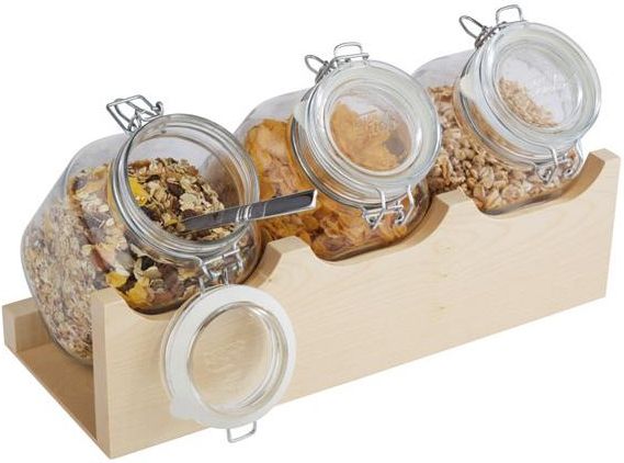 Bufetowy stojak do serwowania APS Good Morning z drewna klonowego, wraz z 3 szklanymi pojemnikami z szczelnymi pokrywkami o pojemności 2 l. Idealny do serwowania musli, płatków śniadaniowych i innych produktów spożywczych. Wykonane z wysokiej jakości materiałów zapewniających długą żywotność i …