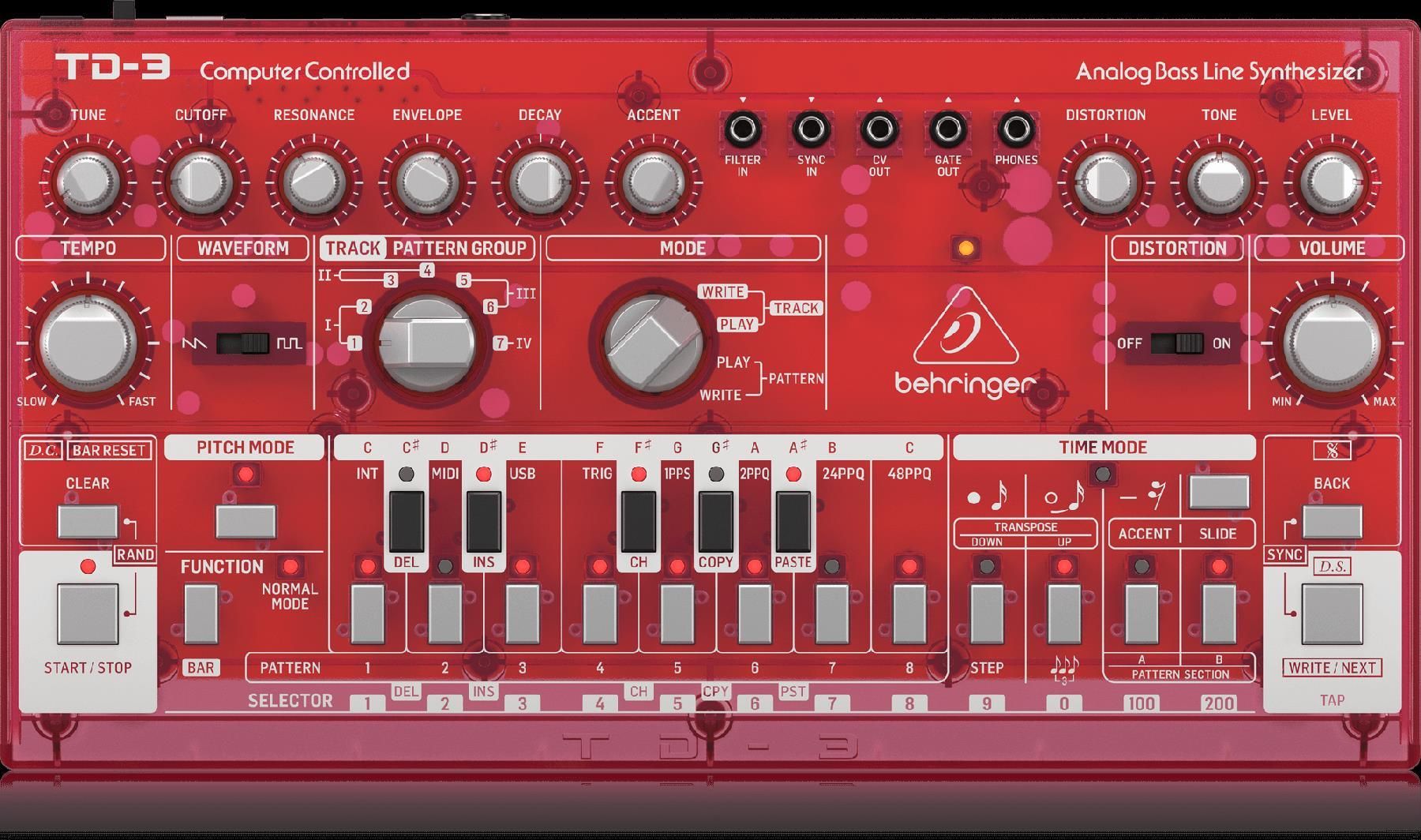 Behringer TD-3-SB – analogowy syntezator linii basowej z VCO, VCF, 16-krokowym sekwencerem, efektami distortion i 16-głosowym poly-chain, kolorze czerwonym w przezroczystej obudowie Główne cechy: Syntezator linii basowych z analogowym obwodem dla dźwięków basu i ścieżki rytmicznej Autentyczne odwzorowanie oryginalnych obwodów z parowanymi tranzystorami W pełni analogowa ścieżka sygnału oparta o legendarne konstrukcje VCO, VCF i VCA VCO z falą piłokształtną i prostokątną, tranzystorowymi obwodami kształtującymi fale Klasyczny, czterobiegunowy filtr dolnoprzepustowy z kontrolą odcięcia, resonance, envelope, decay, accent Łatwy w obsłudze 16-krokowy sekwencer z 7 ścieżkami, każda z 250 patternami użytkownika Arpeggiator z szerokim wachlarzem patternów dla niesamowitych efektów dźwiękowych Obwody Distortion wzorowane na DS-1 dodają pikantności twoim brzmieniom 16-głosowy poly chain umożliwia łączenie wielu syntezatorów dla maksymalnie 16-głosowej polifonii 11 elementów sterujących i 28 przełączników zapewniających bezpośredni dostęp do wszystkich ważnych parametrów w czasie rzeczywistym Pełna implementacja MIDI i USB z wyborem kanału Midi i priorytetem głosu Zaprojektowany we Włoszech