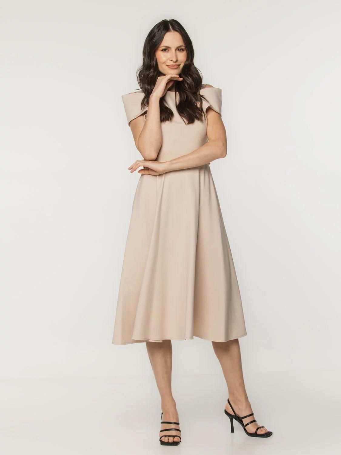 Rozkloszowana sukienka MIDI Rozkloszowana sukienka o długości midi, uszyta z pełnego koła, świetnie sprawdzi się zarówno do pracy, jak i na różnego rodzaju imprezy okolicznościowe. Szerokie ramiączka, zabudowane plecy i dekolt w kształcie łódki dodają sukience elegancji oraz klasy. Forma sukienki i pasek wiązany w talii doskonale modelują sylwetkę, nadając jej kształt klepsydry. Sukienka jest zapinana na zamek błyskawiczny umieszczony na plecach. Kolor główny: beżowa o gładkiej fakturze Rodzaj sukienki: rozkloszowana, długość MIDI, dekolt typu łódka, krótkie, podwijane rękawki Skład tkaniny wierzchniej: 37% wiskoza, 59% poliester, 4% elastan Skład podszewki: 94% poliester, 6% elastan Gwarancja: 24 m-ce Uszyta w Polsce