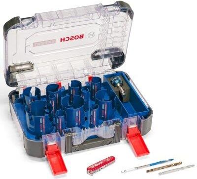 15-częściowy zestaw pił otwornic do materiałów budowlanych Expert marki BOSCH. Otwornice posiadają unikalny system szybkiej wymiany Power Change Plus. Dzięki temu systemowi można również łatwo usunąć rdzeń wiertniczy z otwornicy. Zestaw przeznaczony do wycinania otworów w cegle, miękkich płytkach i płytach gipsowo-kartonowych. Jest niezbędny dla hydraulików i elektryków na placu budowy lub podczas prac remontowych. Dzięki zaledwie kilku ogromnym zębom z węglików spiekanych na stalowym korpusie Expert Construction Material zawsze zapewnia dobry otwór.