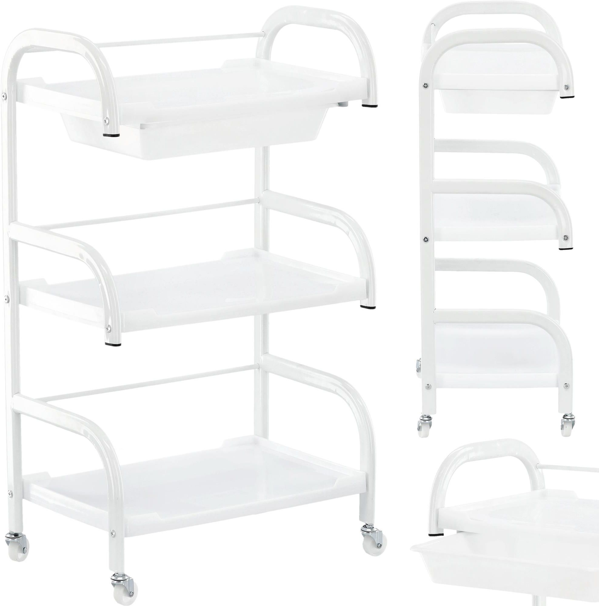 Pomocnik kosmetyczny Calissimo Pomocnik fryzjerski, kosmetyczny jest niezbędnym elementem każdego profesjonalnego salonu. Zapewnia efektywną i szybszą organizację pracy. Pomocnik pozwala na ułożenie wszystkich potrzebnych akcesoriów i produktów w zasięgu ręki w trakcie pracy. Jest ergonomiczny, pozwala na zaoszczędzenie czasu i miejsca w salonie. Dodatkowo, zamontowane kółka, na pewno przyczynią się do poprawy komfortu pracy. Stolik wyróżnia się następującymi cechami Solidna metalowa rama Łatwy w czyszczeniu trwały materiał 3 półki na wszystkie potrzebne rzeczy Wysuwana szuflada na akcesoria Nowoczesny, uniwersalny wygląd Mebel wykonany jest ze świetnej jakości materiałów, jest trwały i stabilny. Ten stabilny mebel idealnie sprawdza się jako stolik pod urządzenia kosmetyczne, jak również jako pomocnik w każdym gabinecie, oferującym usługi odnowy biologicznej czy medycyny estetycznej. Wymiary Wysokość: 83 cm Szerokość: 48 cm Głębokość: 30 cm Wymiar półki: 43,5x29 cm Wyskość między półkami: dolna: 30 cm górna 22 cm