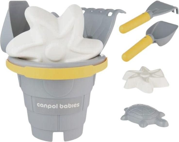 {col/50/} Canpol Zestaw Zabawek Do Piasku W zestawie: Grabki Łopatka Wiaderko, 2 foremki, Wiek dziecka: 12m+ {col/50/} {col/50/} {col/50/} Świetna zabawa! Już teraz zabawa w piasku będzie jeszcze ciekawsza, dzięki zestawowi zabawek do piasku firmy Canpol Babies w pięknych odcieniach szarości i żółtego. W zestawie oprócz wiaderka z uchwytem znajduje się także łopatka, grabki i dwie foremki, z których na pewno zmajstrujesz coś niesamowitego! Zabawki do piasku doskonale urozmaicają wolny czas spędzany na zewnątrz, a także idealnie sprawdzą się do zabawy zarówno w piaskownicy, jak i na plaży. Zabawa w piasku rozwija wyobraźnię przestrzenną i pobudza kreatywność. Maluch uczy się cierpliwości, precyzji oraz uważności.