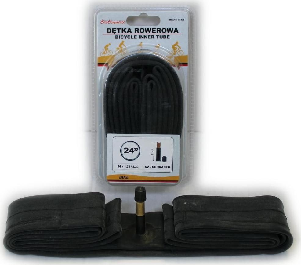 Dętka rowerowa 24x1.75-2.20 48mm AV samochodowySpecyfikacja techniczna Rozmiar dopasowania opony: 24 cala (ETRTO 47–62#8239;mm) Zakres szerokości opony: 1.75–2.20 cala Typ zaworu: AV (wzorem zaworu samochodowego Schrader) — łatwy do napełniania zarówno pompką samochodową, jak i rowerową Materiał: wytrzymały butyl — gwarantuje dobrą elastyczność i szczelnośćNajważniejsze zalety Szeroki zakres rozmiaru — jedna dętka pasuje do różnych opon, co ułatwia dopasowanie W uproszczonym serwisie — zawór AV pozwala na bezproblemowe dopompowanie nawet w warunkach terenowych Solidne wykonanie — butyl to trwały materiał zapewniający długą żywotność produktuZastosowanie Idealna do naprawy lub wymiany dętki w rowerach dziecięcych, miejskich, trekkingowych czy MTB w rozmiarze 24" Sprawdzi się jako zapasowa do przewożenia w trasie po podmokłych, leśnych lub miejskich terenach
