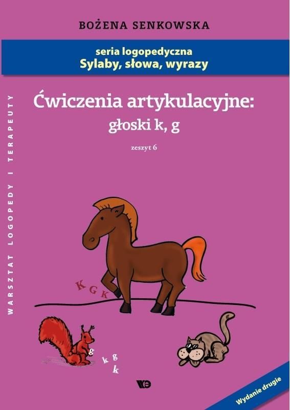 Nowe wydanie - w dużym formacie z kolorową wkładką do wycięcia! Szósty zeszyt ćwiczeń logopedycznych z serii „Sylaby, słowa, wyrazy” przeznaczony jest dla dzieci w wieku od 5 do 9 lat z nieprawidłową wymową głosek „k”, „g”. Nieprawidłowości polegają najczęściej na zamianie głoski „k” na „t” (np. zamiast „koło” dziecko mówi „toło”) oraz „g” na „d” (np. zamiast „guma” dziecko mówi „duma”). Głoski „k” oraz „g” mogą być również opuszczane w wyrazach lub (rzadziej) zniekształcane. Materiał zawarty w zeszycie obejmuje ćwiczenia głoski „k” oraz „g” osobno oraz ćwiczenia każdej z tych głosek w opozycji: „k” do „t”; „g” do „d”.