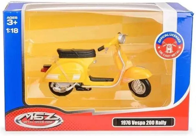 Vespa 200 Rally z 1976 r. to doskonała replika kultowego skutera Vespa z 1976 r. Ten precyzyjnie wykonany model w skali 1:18 zachwyci każdego miłośnika motoryzacji. Dzięki klasycznemu stylowi i wyjątkowemu żółtemu wykończeniu Vespa 200 Rally jest prawdziwym przedmiotem kolekcjonerskim. Model metalowy z elementami plastikowymi przeznaczony jest dla dzieci powyżej 3. roku życia. Pokryty jest nietoksyczną farbą i wykonany z mocnych i bezpiecznych materiałów.
