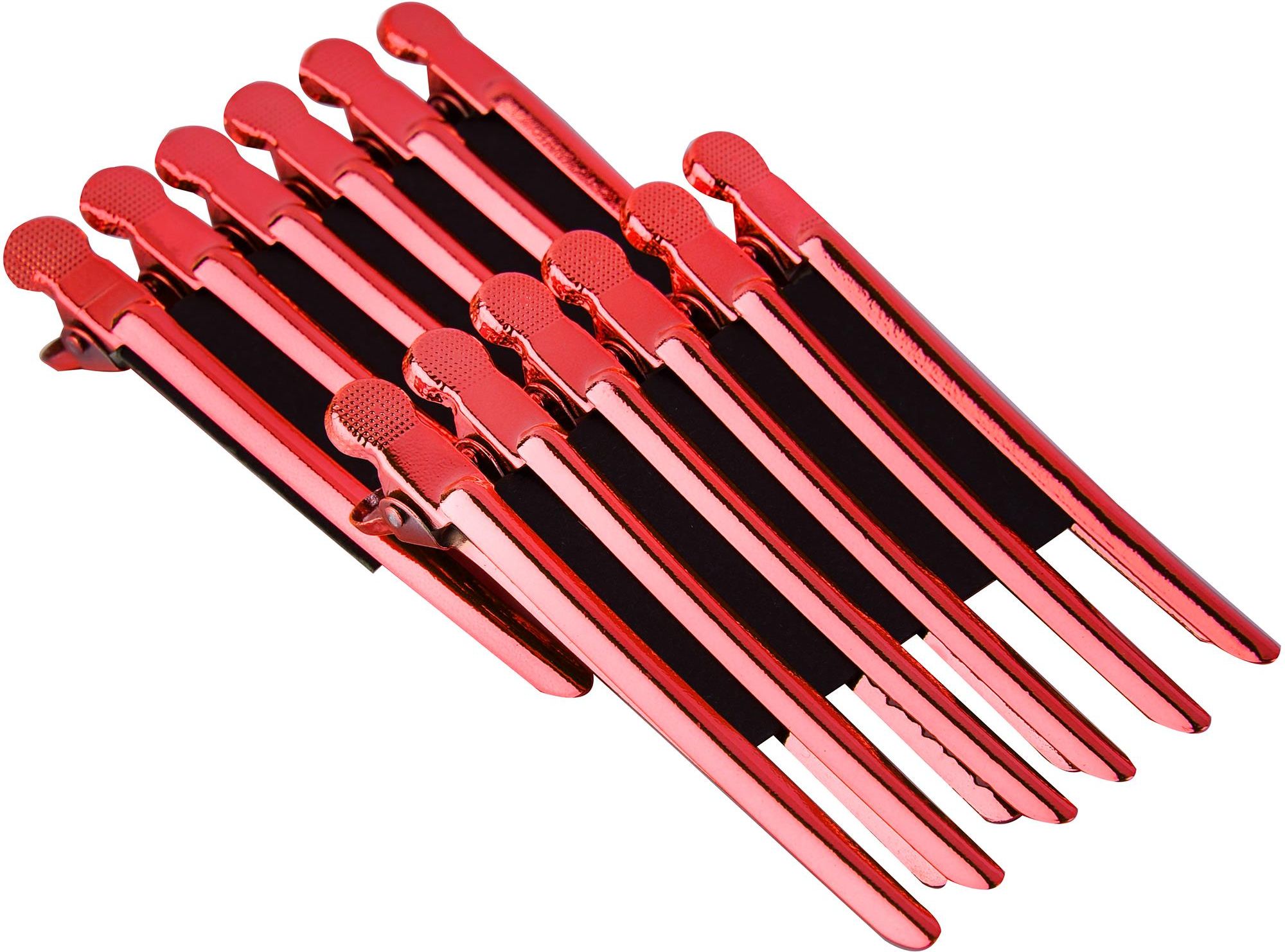 Posiadają specjalny kształt, który gwarantuje doskonałe podtrzymanie pasm włosów, nawet w przypadku bardzo długich i gęstych włosów. Klipsy fryzjerskie do podtrzymywania sekcji włosów podczas stylizacji, zapewniają komfortową pracę, świetnie nadają się do długich włosów. Bardzo trwałe, wyprodukowane ze stali. Kolor: Czerwony Ilość: 12 szt. Długość: 10 cm