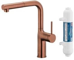 Bateria kuchenna z filtracją wody oraz wyciąganą wylewką DUERO PURE MOVE BRUSHED ROSE GOLD Dlaczego warto filtrować wodę? Linia baterii kuchennych Duero Pure z funkcją filtrowania wody to esencja zdrowia, wygody oraz troski o środowisko w jednym. Dzięki filtrowi węglowemu możesz cieszyć się smaczną i czystą wodą prosto z kranu, eliminując konieczność sięgania po wodę butelkowaną. To nie tylko komfortowe rozwiązanie, lecz także ekologiczne, bo picie wody z kranu to realne kilogramy oszczędzonego plastiku z butelek Komfortowe filtrowanie Baterie kuchenne Duero Pure kryją wewnątrz dwa oddzielne kanały: dla wody filtrowanej i niefiltrowanej, co gwarantuje, że nie mieszają się one ze sobą. Zamontowany pod zlewem filtr oczyszcza przepływającą przez niego wodę, dostarczając ją wprost „do szklanki”. W baterii Duero Pure Style funkcja filtrowania wody uruchamiana jest przyciskiem z przodu wylewki. Doskonała funkcjonalność Bateria kuchenna Duero Pure Style to nie tylko doskonałe filtrowanie wody, ale także kompleksowe rozwiązanie, które znacząco ułatwia codzienne czynności kuchenne. Dzięki obrotowej, wyciąganej wylewce oraz możliwości zmiany typu strumienia wody zapewnia wyjątkowy komfort użytkowania zarówno podczas gotowania, jak i mycia naczyń. Dostępność w trzech nowoczesnych kolorach umożliwia łatwe dopasowanie baterii do stylistyki Twojej kuchni. Teraz wybór idealnej baterii staje się prostszy niż kiedykolwiek wcześniej. Filtry dopasowane do potrzeb Baterie Duero Pure są wyposażone w wysokiej jakości filtry włoskiej firmy Profine, które redukują zawartość chloru, związków organicznych oraz eliminują nieprzyjemne zapachy i smaki z wody. Co ważne, spełniają normy dyrektywy UE 98/83/WE. Dostępne w trzech wariantach, pozwalają na idealne dopasowanie do indywidualnych potrzeb każdego domu. Intuicyjny montaż DUERO PURE Montaż baterii Duero Pure jest niezwykle intuicyjny dzięki dopracowanemu w szczegółach projektowi. Bezproblemowo zamontujesz baterię wraz z filtrem, a późniejsza wymiana filtra będzie równie łatwa i bezstresowa. Co więcej, w zestawie znajdziesz praktyczny licznik informujący o zbliżającym się terminie wymiany filtra. Wszystko w zestawie W zestawie startowym znajdują się przyłącza elastyczne (dł. 600 mm), ciężarek, komplet mocujący z podkładką, zestaw startowy z filtrem HYDRO + (filtr, głowica, zawór 3/8”×3/8”×1/4", wężyk przyłączeniowy 1/4" (dł. 2000 mm), licznik przepływu wody z monitorem, złączki i uszczelki, spinki zabezpieczające, pasek do pomiaru twardości wody, taśma teflonowa, 2×bateria AA). Dane techniczne Kolor: miedź szczotkowana PVD Napowietrzacz: tak Przepływ wody [l/min]: 5,4 Rodzaj filtra: HYDRO + Żywotność filtra: 6 miesięcy Ciśnienie robocze [atm]: 3 Temperatura wody [°C] maks.: ≤90/65 Wylewka: wyciągana Długość wylewki [mm]: 221,5 Ilość strumieni: 1 Grupa akustyczna: II