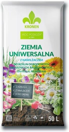 Uniwersalna ziemia o pojemności 50 l marki Kronen. Doskonałej jakości produkt z zawartością Ecofibrex (dodatek z włókien drzewnych), który posiada w swoim składzie nawilżacz i wieloskładnikowy nawóz z mikroelementami. Ziemia jest przeznaczona do sadzenia, przesadzania wielu rodzajów roślin zielonych i kwitnących, iglaków, bylin, ziół, warzyw na balkonach, tarasach, ogrodach oraz pomieszczeniach. Nie należy jej stosować do roślin kwaśnolubnych. Podłoże jest wyprodukowane na bazie torfu wysokiego o różnym stopniu rozkładu.