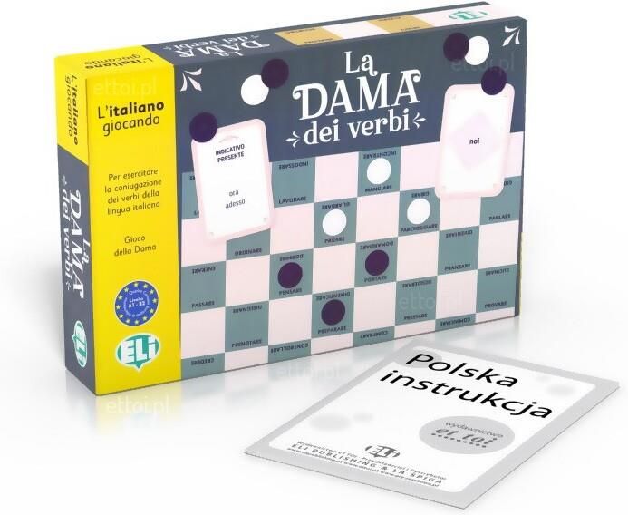 La Dama dei Verbi. Gra językowa ELI & ET TOI Gra językowa La Dama dei Verbi - gra planszowa w warcaby ucząca włoskich czasowników regularnych, nieregularnych i zwrotnych. Gra z instrukcjami w językach włoskim i polskim oraz dodatkową kostką do gry. La Dama dei Verbi jest grą edukacyjną służącą …