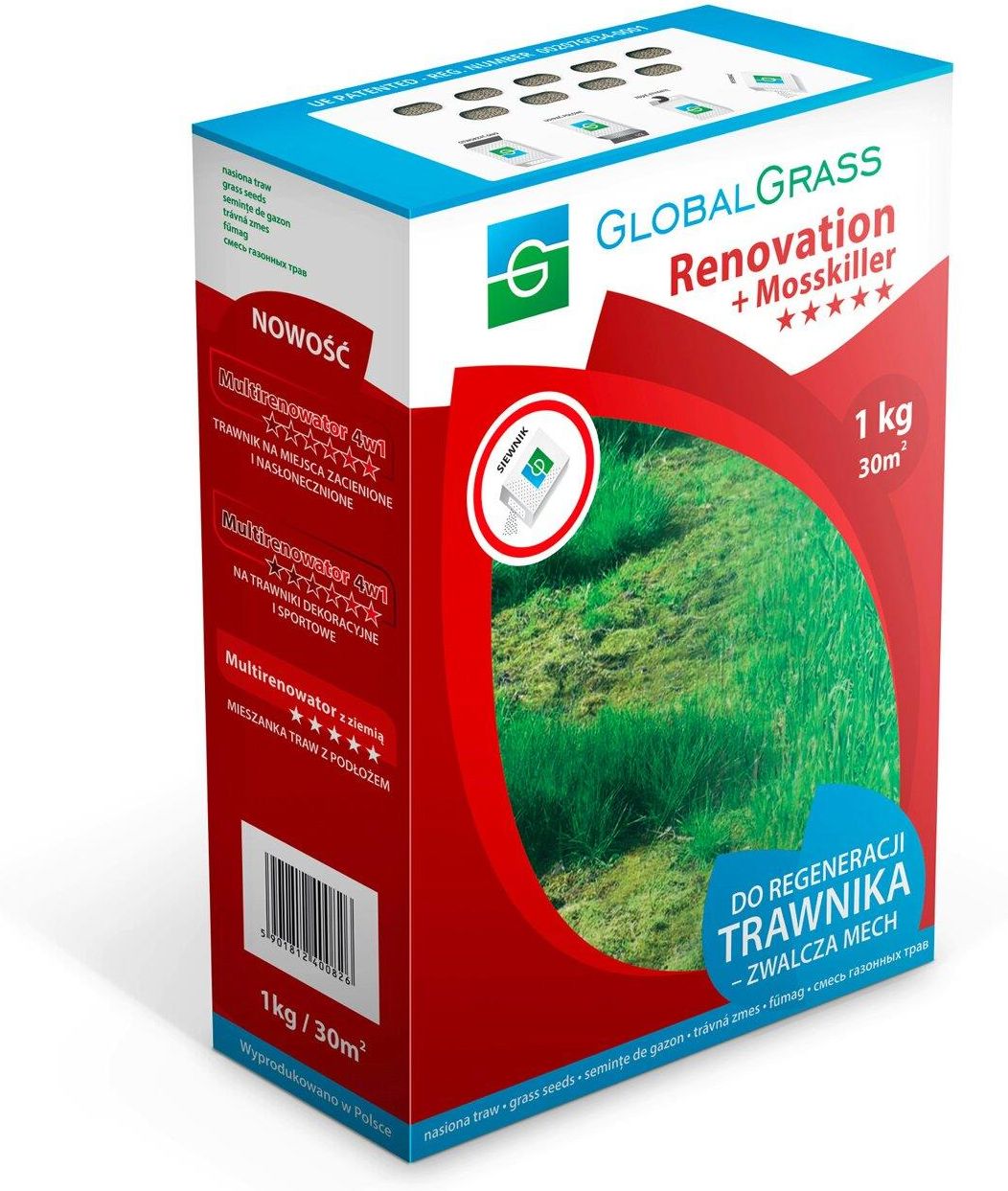Mieszanka traw Renovation + Mosskiller 1 kg marki Global Grass.Unikalna mieszanka nasion otoczkowanych substancją zwalczającą mech na trawniku.Przeznaczona do regeneracji trawnika.Pudełko z wysiewnikiem.Opakowanie 1 kg wystarcza na 30 m2.